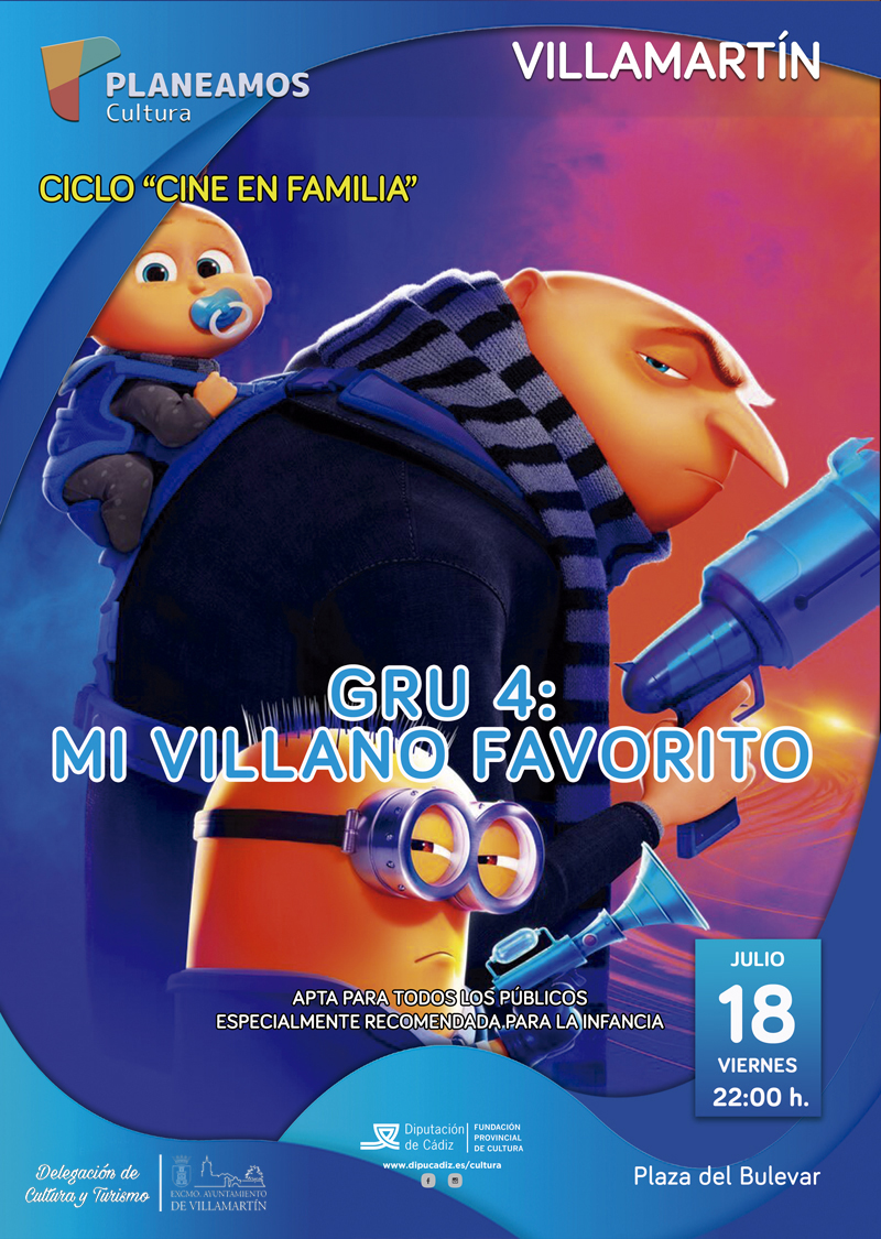 El próximo viernes 18 de julio a partir de las 22:00 horas tienes una cita con el cine en la Plaza del Bulevar. Es otra de las actividades gratuitas previstas dentro del Verano Cultural y diseñado por la Delegación de Cultura. La película seleccionada, encuadrada en el ciclo "Cine en Familia", es apta para todos los públicos y especialmente recomendada para la infancia. En esta entrega de la saga, Gru, Lucy y las niñas -Margo, Edith y Agnes- dan la bienvenida a un nuevo miembro en la familia: Gru Junior, que parece llegar con el propósito de ser un suplicio para su padre. Gru tendrá que enfrentarse en esta ocasión a su nueva némesis Maxime Le Mal y su sofisticada y malévola novia Valentina, lo que obligará a la familia a tener que darse a la fuga. Esta sesión de cine se celebra gracias al programa Planeamos, dentro del convenio suscrito con la Diputación de Cádiz a través de la Fundación Provincial de Cultura. ¡Disfruta del verano cultural en familia!