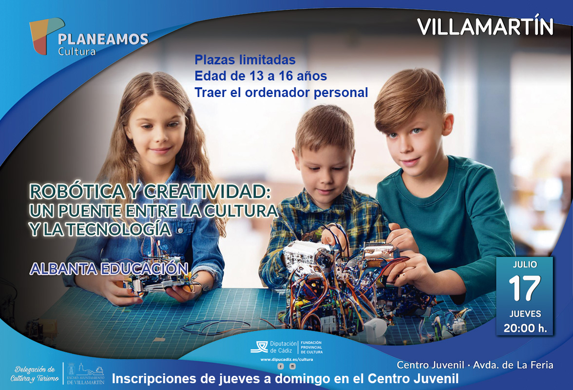 El próximo jueves 17 de julio a las 20.00 horas está prevista la celebración del taller Robótica y creatividad: un puente entre la cultura y la tecnología, en el Centro Juvenil. Este taller se incluye engloba en la programación de verano preparada por la Delegación de Cultura gracias al convenio con la Fundación Provincial de Cultura y el Programa Planeamos. La entidad encargada de impartir el taller es Albanta Educación, dará comienzo a las 20:00 horas y todos los jóvenes, entre 13 y 16 años, que quieran inscribirse pueden hacerlo desde hoy hasta el domingo en el Centro Juvenil, en la avenida de la Feria. En la medida de lo posible, cada inscrito deberá acudir al taller con su propio ordenador personal (portátil). Para garantizar el aprovechamiento del taller, las plazas están limitadas a 20 personas.