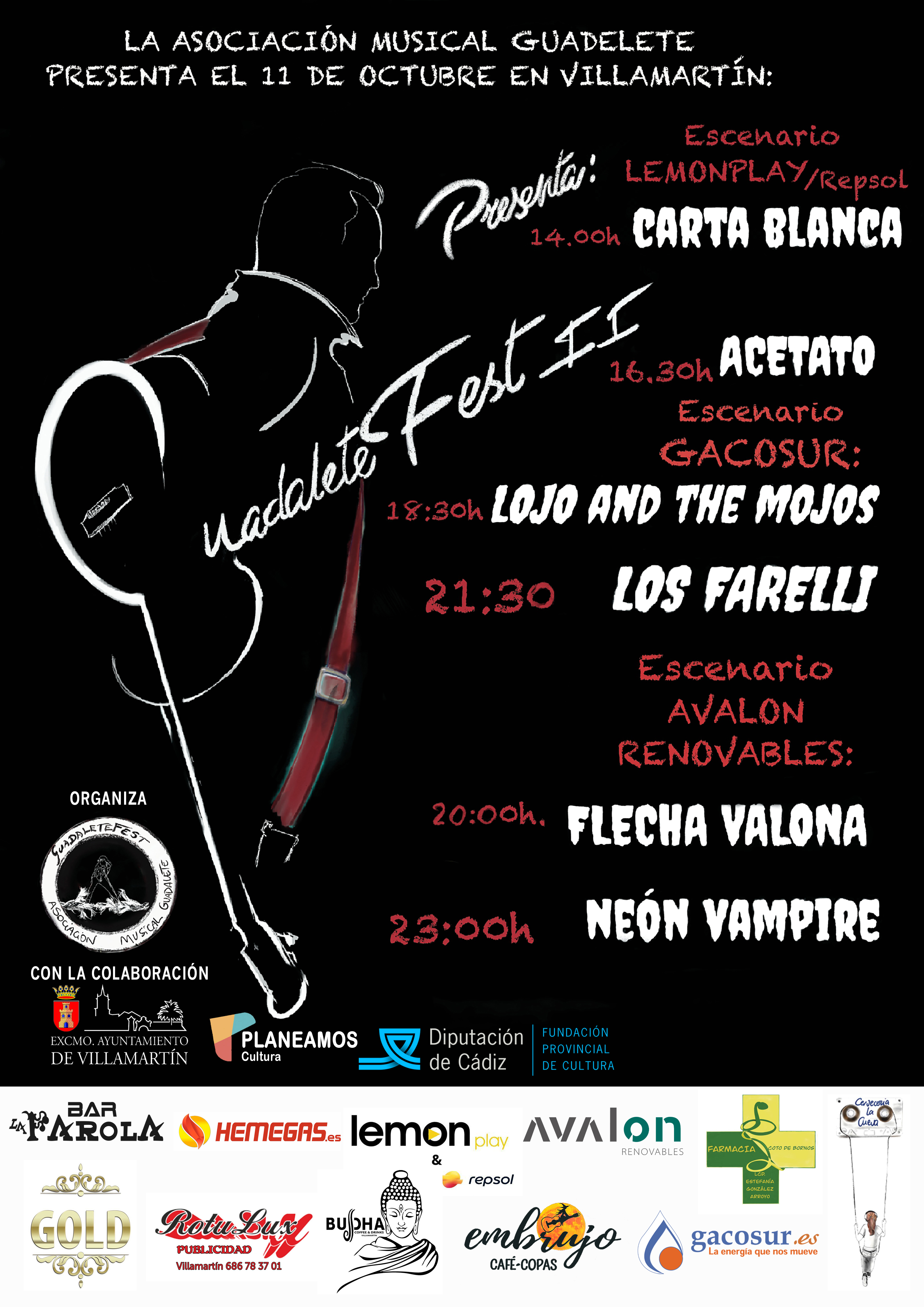 El Guadaletefest comenzará a partir de las 14:00 h. en la plaza del Bulevar, desde el escenario Lemon Play/Repsol, actuarán el grupo de rock urbano Carta Blanca y a las 16:30 h. el mítico grupo local de música pop Acetato.
