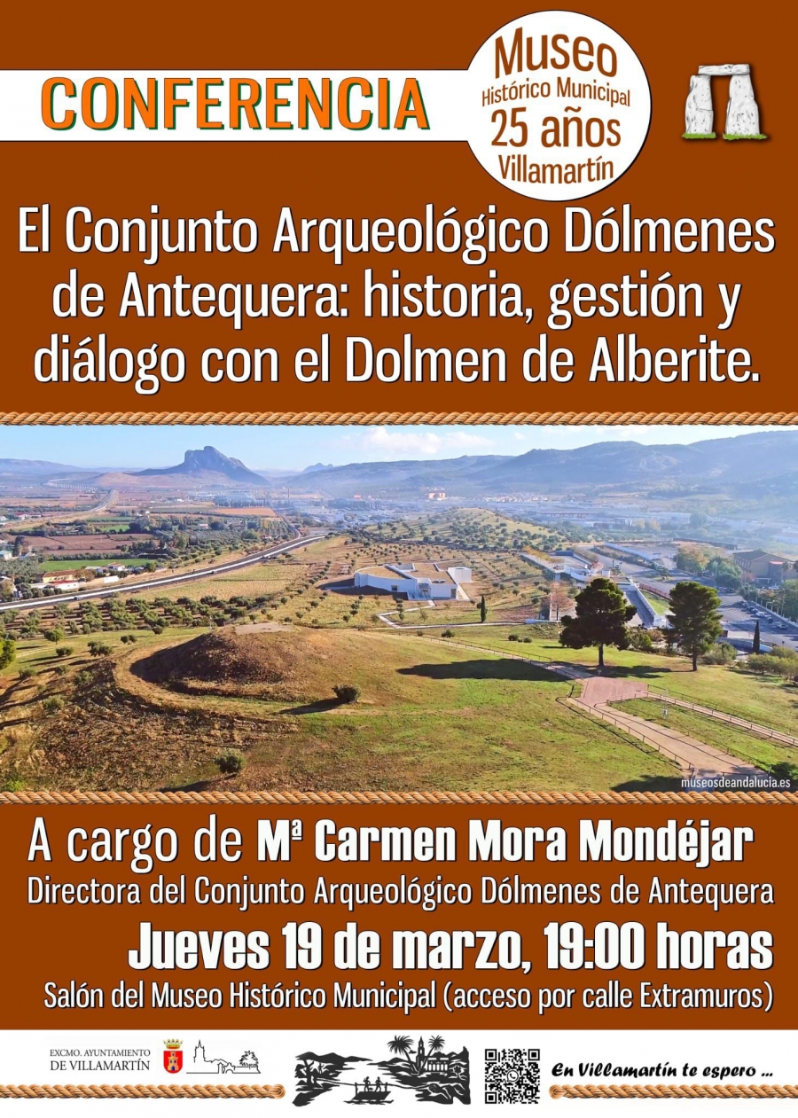 Dentro del ciclo de conferencias programadas por el Ayuntamiento de Villamartín con motivo de la conmemoración del 25 Aniversario del Museo Histórico Municipal, este jueves 19 se presenta “El conjunto arqueológico Dólmenes de Antequera: Historia, gestión y diálogo con el dolmen de Alberite”, a cargo de Carmen Mora Mondéjar, directora del Conjunto Arqueológico Dólmenes de Antequera, quien ofrecerá una interesante conferencia a través de un diálogo entre el dolmen de Alberite y uno de los conjuntos megalíticos más importantes del mundo.
