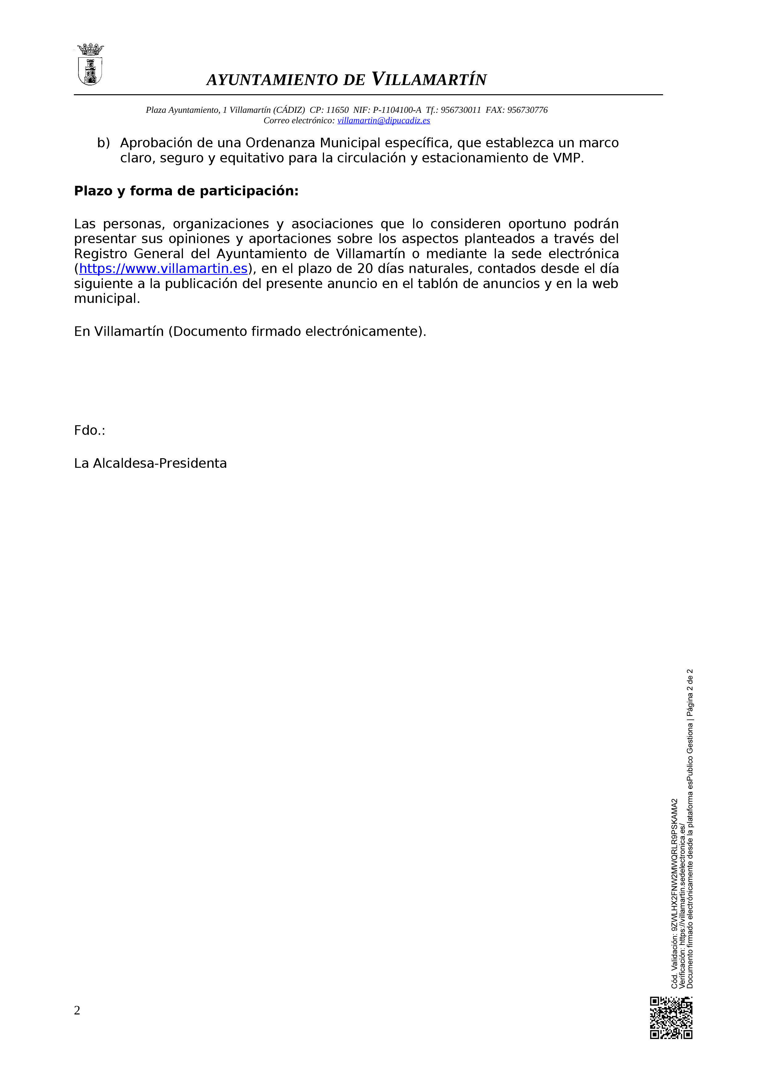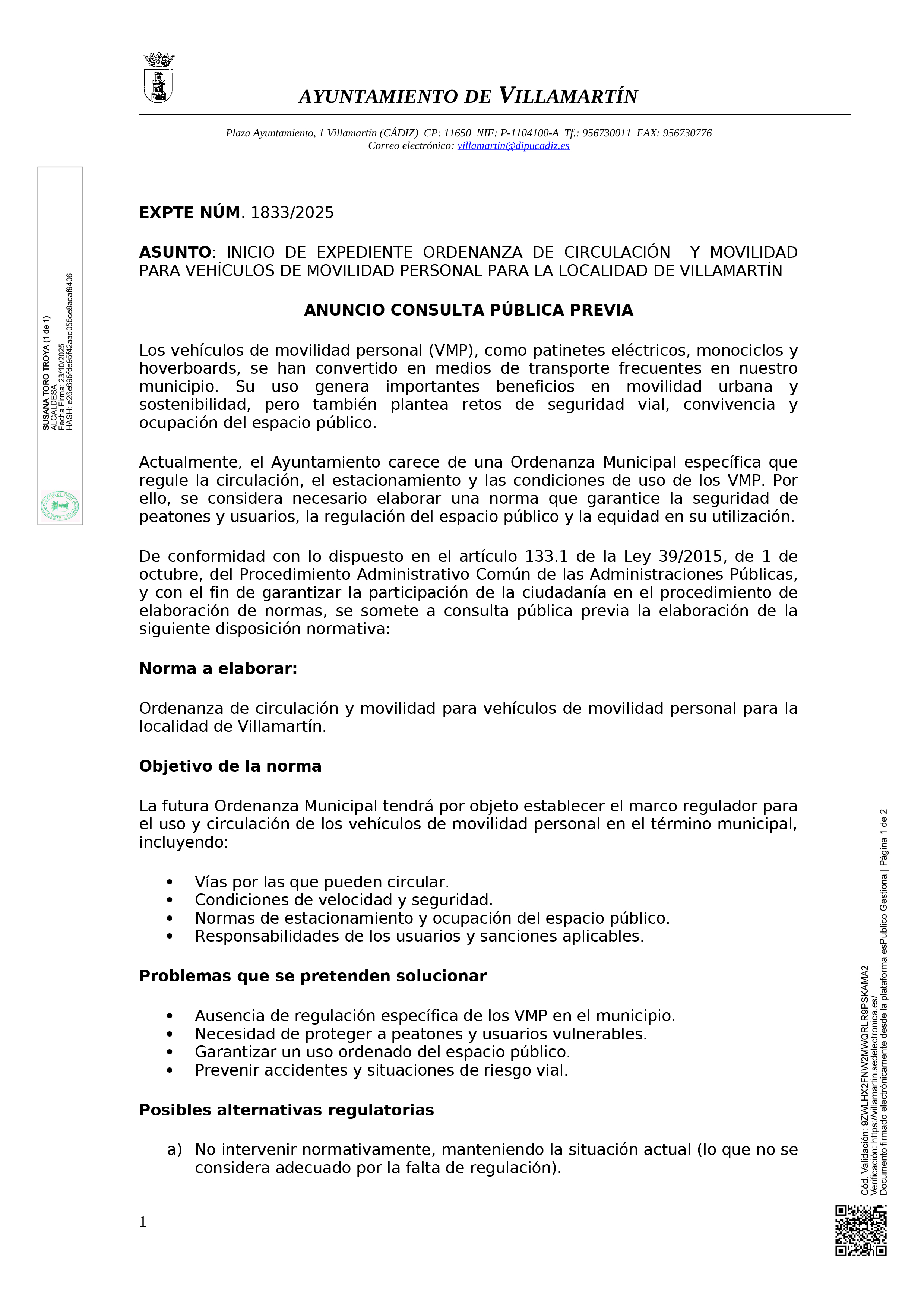 Inicio de expediente ordenanza de circulación de movilidad para vehículos de movilidad personal para la localidad de Villamartín.