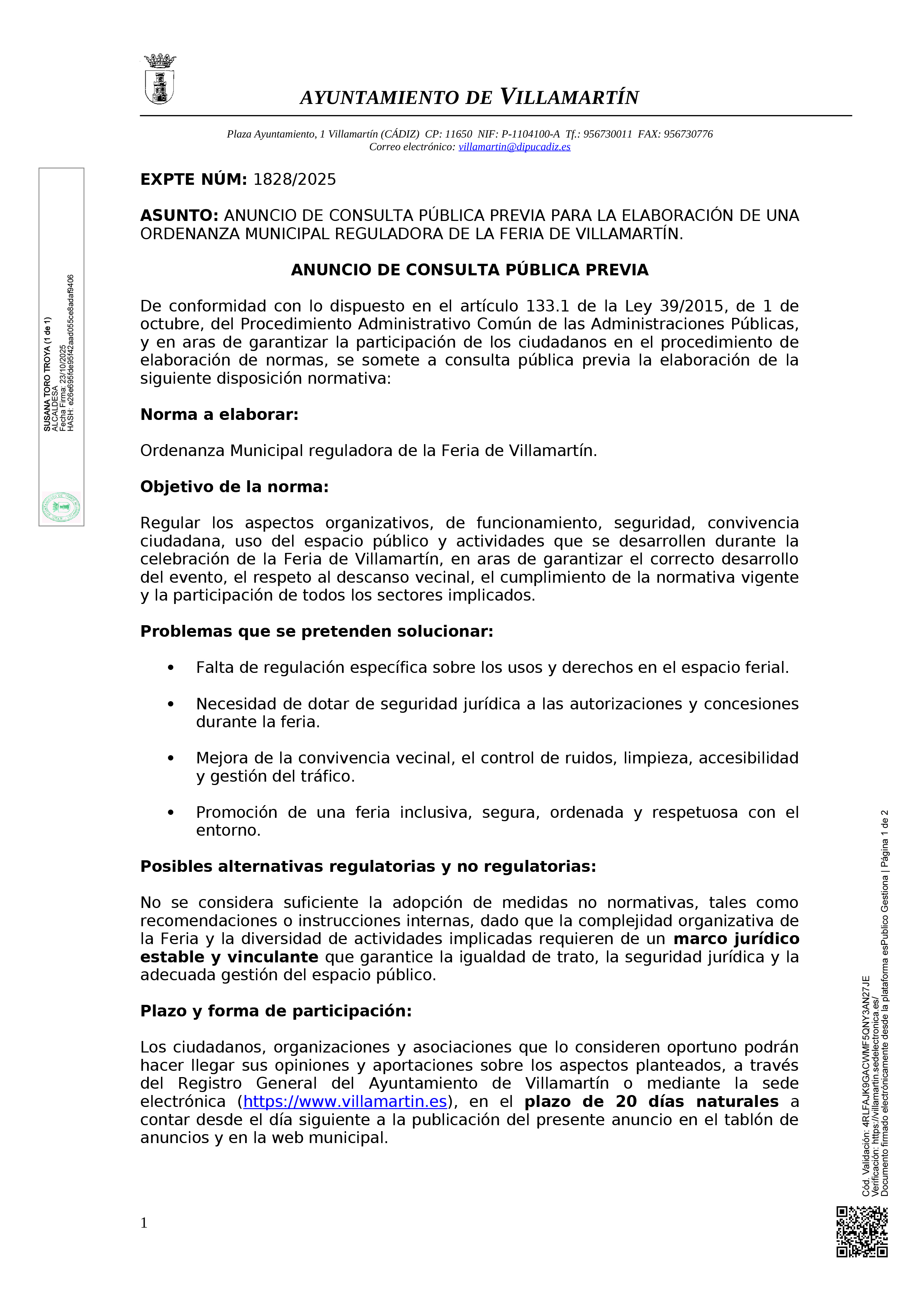 Anuncio de consulta pública previa para al elaboración de una ordenanza municipal reguladora de la Feria de Villamartín.