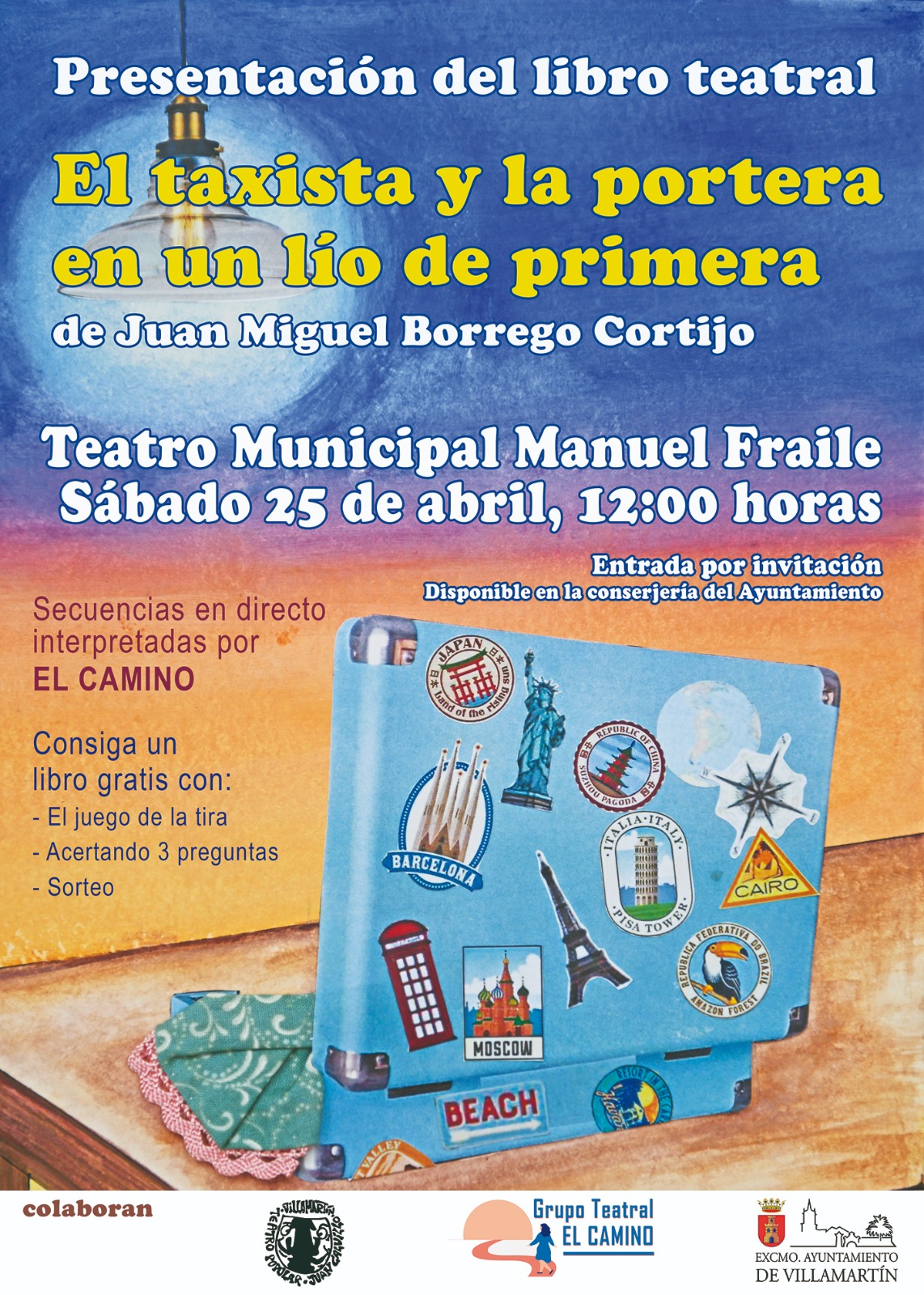 Este sábado 25 de abril, en el marco de la celebración del Día del Libro, se presenta “El taxista y la portera en un lío de primera”, la nueva obra de Juan Miguel Borrego Cortijo, director del Teatro popular Juan Calvillo, que nos presentará un nuevo libro teatral.