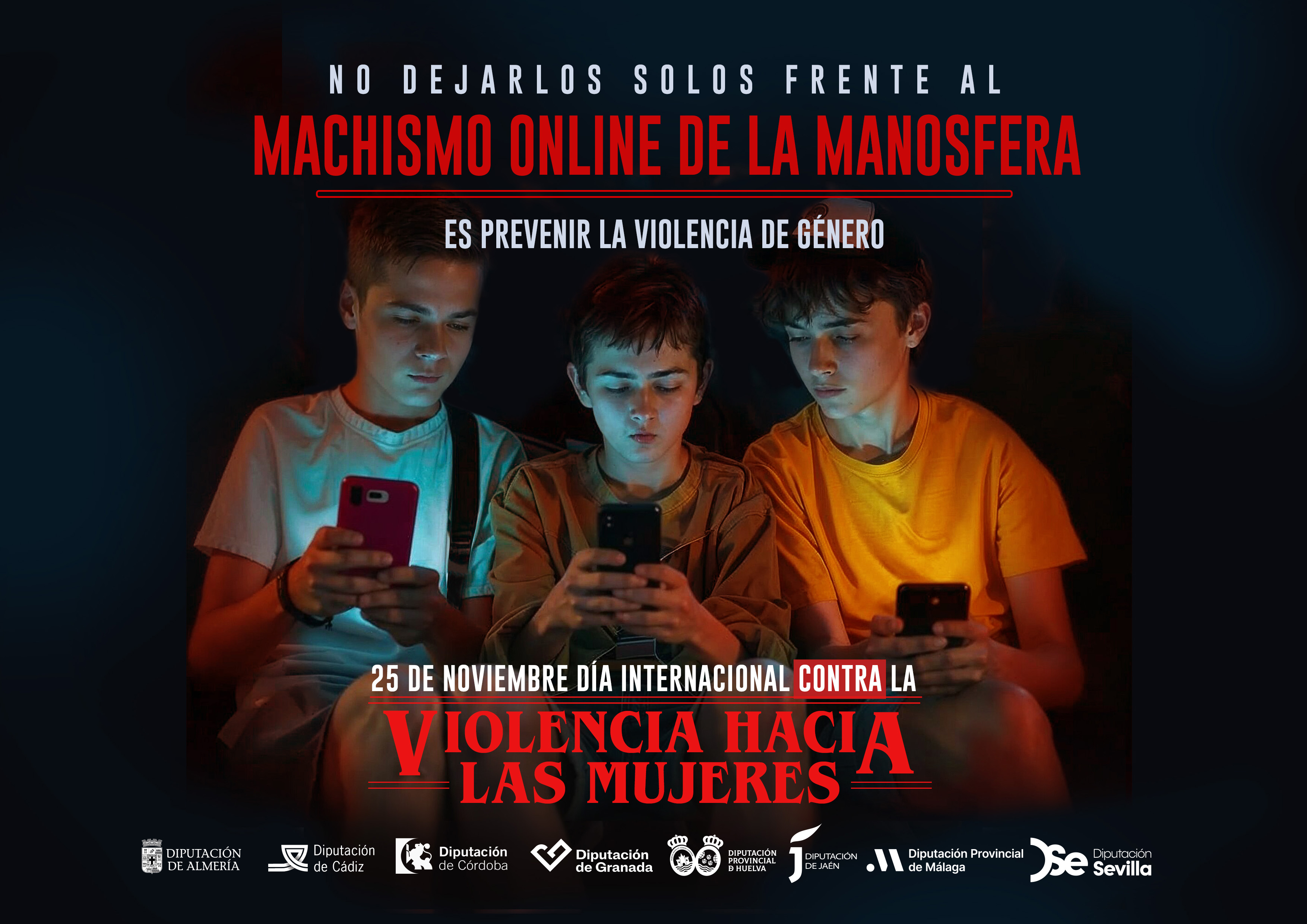 El lema de la campaña del 25N es este año: “No dejarlos solos frente al machismo online de la manosfera es prevenir la violencia de género", elegido por las diputaciones de Andalucía “para actuar con la urgencia que requiere este contexto, porque la violencia digital no es inofensiva, la captación digital de jóvenes y adolescentes es un grave problema”.